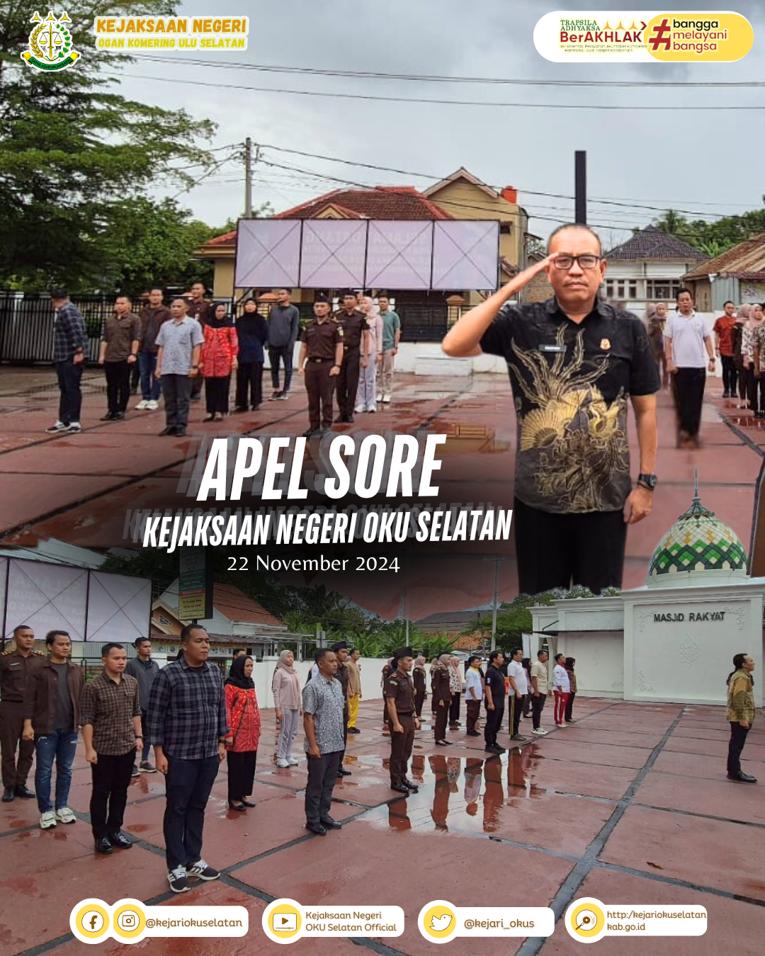 Jum’at, 22 November 2024 Pukul 16.00 WIB telah dilaksanakan Apel Sore di Lapangan Kantor Kejaksaan Negeri Ogan Komering Ulu Selatan.…