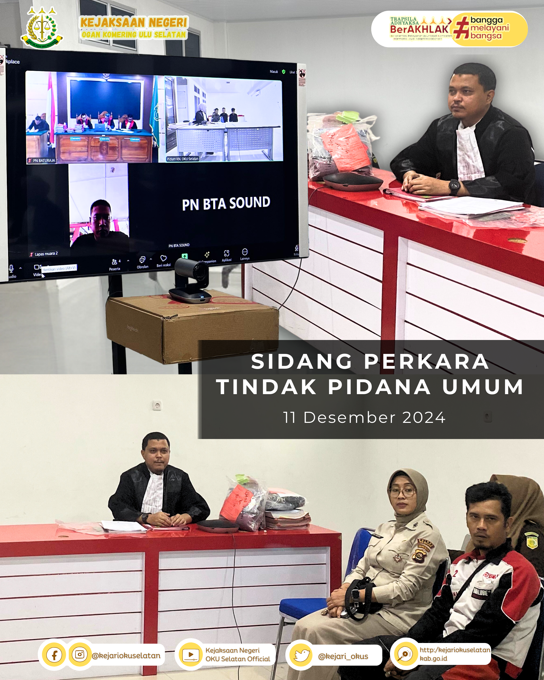 Rabu, 18 Desember 2024 telah dilaksanakan Kegiatan Sidang Tindak Pidana Umum Kejaksaan Negeri Ogan Komering Ulu Selatan secara daring melalui zoom. Jaksa Penuntut Umum melaksanakan sidang di Ruang Tindak Pidana Umum Kejaksaan Negeri Ogan Komering Ulu Selatan, Majelis Hakim melaksanakan sidang di Ruang Sidang Pengadilan Negeri Baturaja serta para terdakwa menjalani sidang bertempat di Lapas Kelas IIB Muaradua.