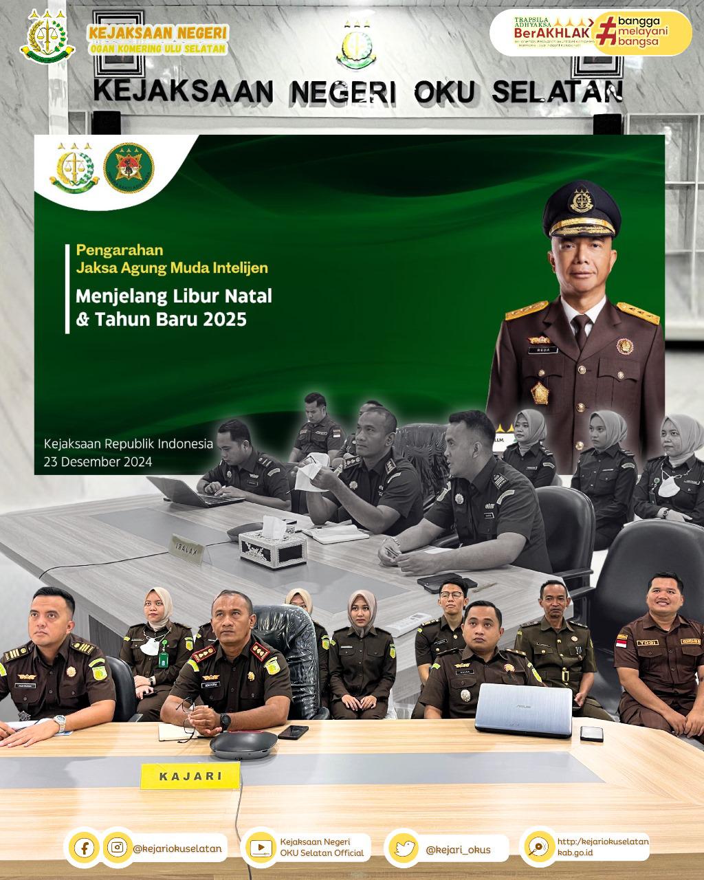Senin, 23 Desember 2024 pukul 09.00 yang bertempat di Aula Kantor Kejaksaan Negeri Ogan Komering Ulu Selatan, Kepala Kejaksaan Negeri Ogan Komering Ulu Selatan Bapak Beni Putra, S.H., M.H beserta PLH Kepala Seksi Bidang Intelijen Bapak Aldi Rinanda Rijasa.,S.H.,M.H, Kasubsi dan seluruh Jajaran Bidang Intelijen Kejaksaan Negeri Ogan Komering Ulu Selatan mengikuti Pengarahan Akhir Tahun Jaksa Agung Muda Intelijen Menjelang Libur Natal & Tahun Baru 2025 yang dilakukan secara daring melalui Zoom Meeting.