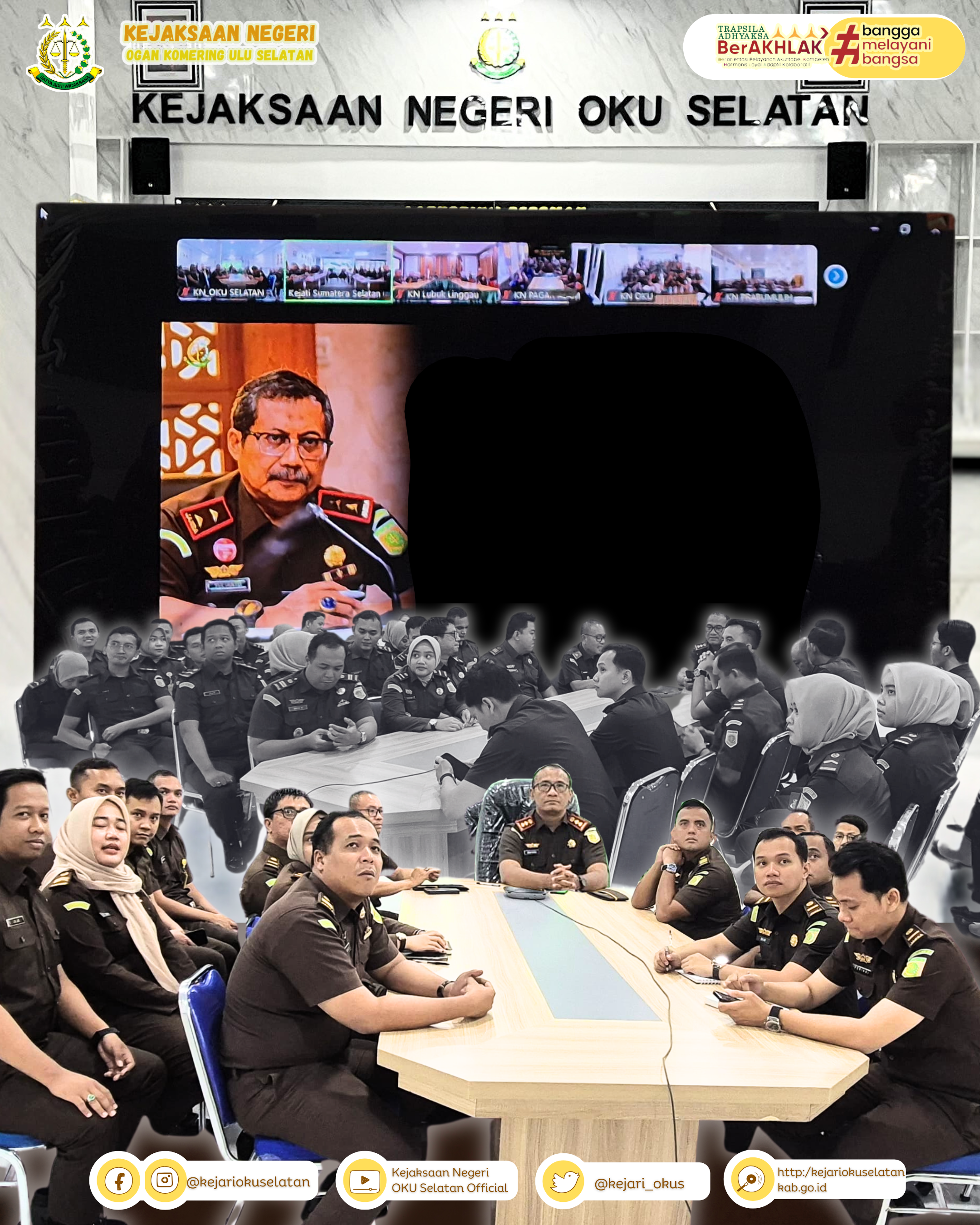 Senin, 30 Desember 2024 sekira pukul 08.00 WIB yang bertempat di Aula Kantor Kejaksaan Negeri Ogan Komering Ulu Selatan, Kepala Kejaksaan Negeri OKU Selatan, Bapak Beni Putra, S.H., M.H, yang diikuti oleh seluruh Kepala Seksi, Kepala Sub Bagian Pembinaan, seluruh Kepala SubSeksi, Jaksa Fungsional dan seluruh Pegawai Kejaksaan Ogan Komering Ulu Selatan mengikuti Rapat Koordinasi yang dibuka dan dipimpin langsung oleh Kepala Kejaksaan Tinggi Sumatera Selatan yang dilakukan secara daring melalui Zoom Meeting.