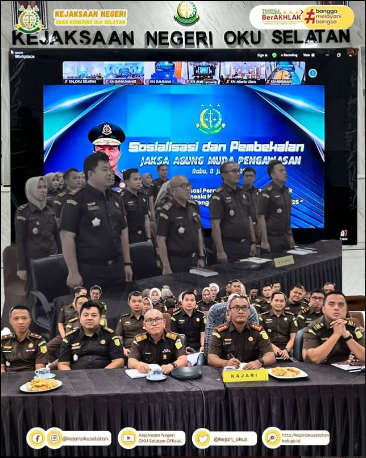 Rabu, 08 Januari 2025 sekira pukul 09.00 WIB yang bertempat di Aula Kantor Kejaksaan Negeri Ogan Komering Ulu Selatan, Kepala Kejaksaan Negeri OKU Selatan, Bapak Beni Putra, S.H., M.H, yang diikuti oleh seluruh Kepala Seksi, Kepala Sub Bagian Pembinaan, seluruh Kepala SubSeksi, Jaksa Fungsional dan seluruh Pegawai Kejaksaan Ogan Komering Ulu Selatan mengikuti Sosialisasi dan Pembekalan Jaksa Agung Muda Pengawasan mengenai “Peraturan Kejaksaan Republik Indonesia Nomor 3 Tahun 2024 tentang Organisasi dan Tata Kerja Kejaksaan Republik Indonesia dan Pembekalan Penggunaan Anggaran Tahun 2025” yang dilakukan secara daring melalui Zoom Meeting.