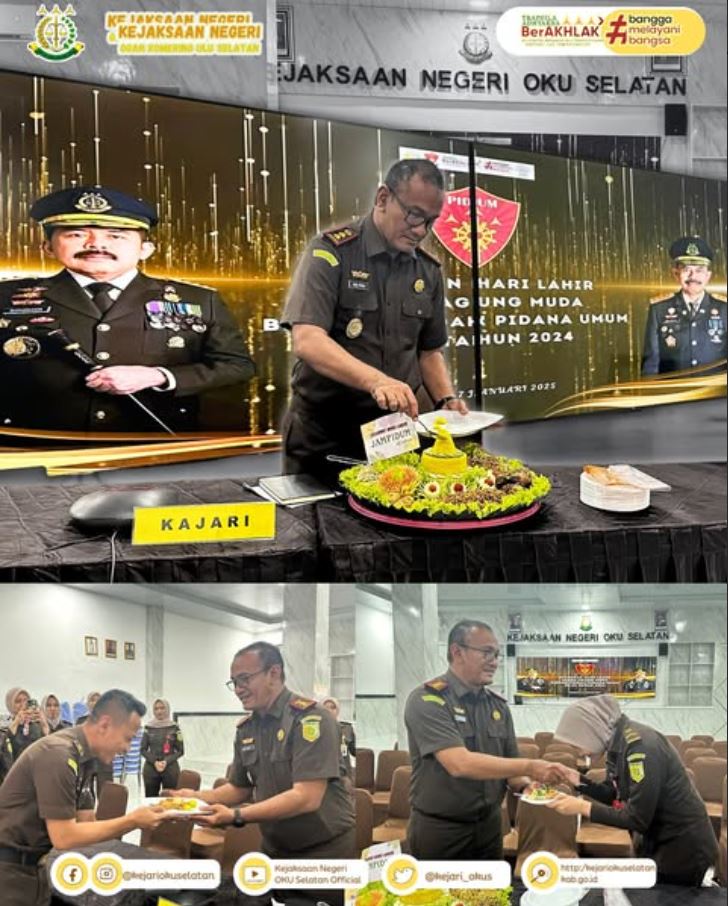 Selasa, 7 Januari 2025, Kepala Kejaksaan Negeri Ogan Komering Ulu Selatan, Bapak Beni Putra, S.H., M.H., bersama para Kasi, Kasubagbin, Kasubsi, Jaksa Fungsional, dan seluruh pegawai mengikuti Syukuran Peringatan Hari Lahir Jaksa Agung Muda Bidang Pidana Umum (JAM PIDUM) ke-42 secara daring di Aula Kantor Kejaksaan Negeri Ogan Komering Ulu Selatan.