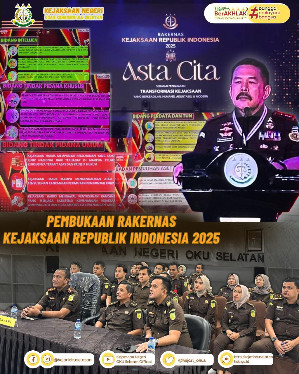 Selasa, 14 Januari 2025 pukul 08.00 bertempat di Aula Kantor Kejaksaan Negeri Ogan Komering Ulu Selatan, Kepala Kejaksaan Negeri Ogan Komering Ulu Selatan, Bapak Beni Putra.,S.H.,M.H mengikuti Pembukaan Rapat Kerja Nasional tahun 2025 dengan tema “ASTA CITA sebagai Penguatan Tranformasi Kejaksaan yang berkeadilan, Humanis, Akuntabel dan Modern” secara daring melalui Zoom Meeting.