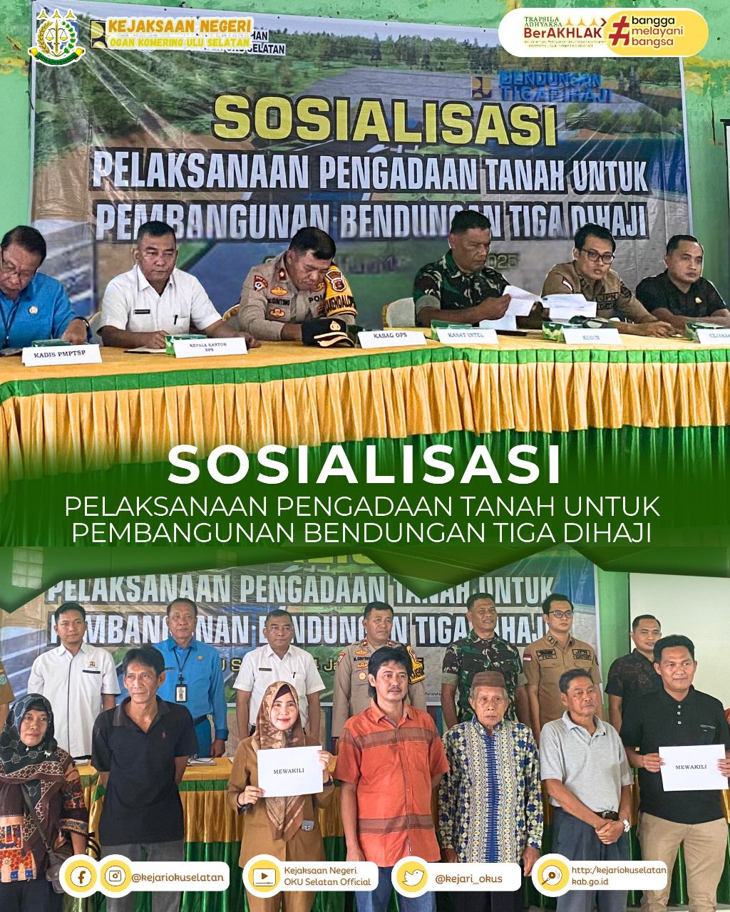 Selasa, 14 Januari 2025 bertempat di Aula Kantor Camat Tiga Dihaji Kabupaten Ogan Komering Ulu Selatan, Kepala Kejaksaan Negeri Ogan Komering Ulu Selatan, Bapak Beni Putra, S.H., M.H yang diwakili oleh Kepala Subseksi Bidang Intelijen, Angga Winiardo Putra, S.H dan Jaksa Pengacara Negara Bidang Perdata dan Tata Usaha Negara, Feriadi, S.H menghadiri “Sosialisasi Pelaksanaan Pengadaan Tanah untuk Pengadaan Bendungan Tiga Dihaji”.