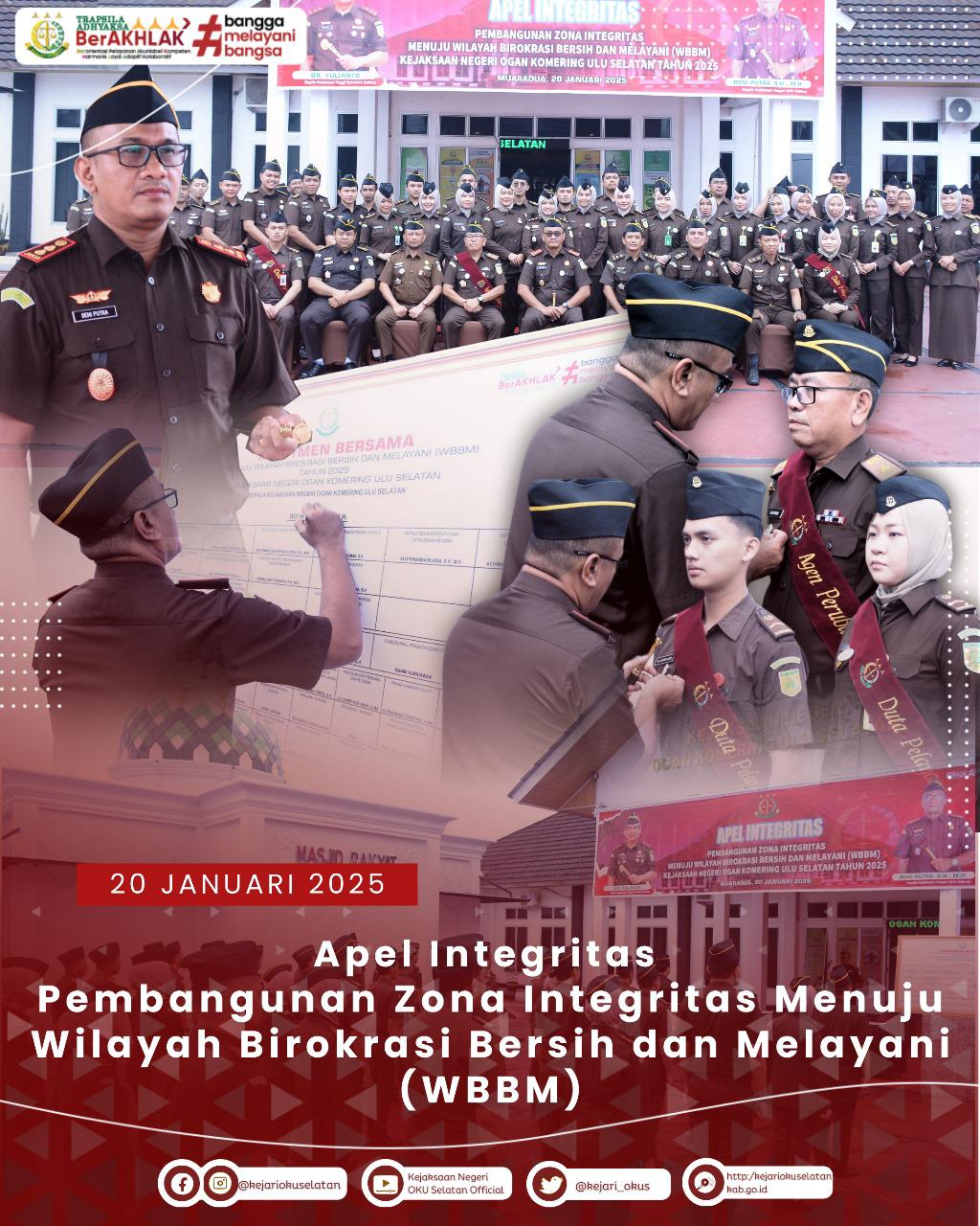 Senin, 20 Januari 2025 Pukul 08.00 WIB bertempat di Lapangan Kantor Kejaksaan Negeri Ogan Komering Ulu Selatan telah dilaksanakan Apel Integritas Pembangunan Zona Integritas Menuju Wilayah Birokrasi Bersih dan Melayani (WBBM) Kejaksaan Negeri Ogan Komering Ulu Selatan Tahun 2025 yang dilaksanakan serentak di Wilayah Hukum Kejaksaan Tinggi Sumatera Selatan.