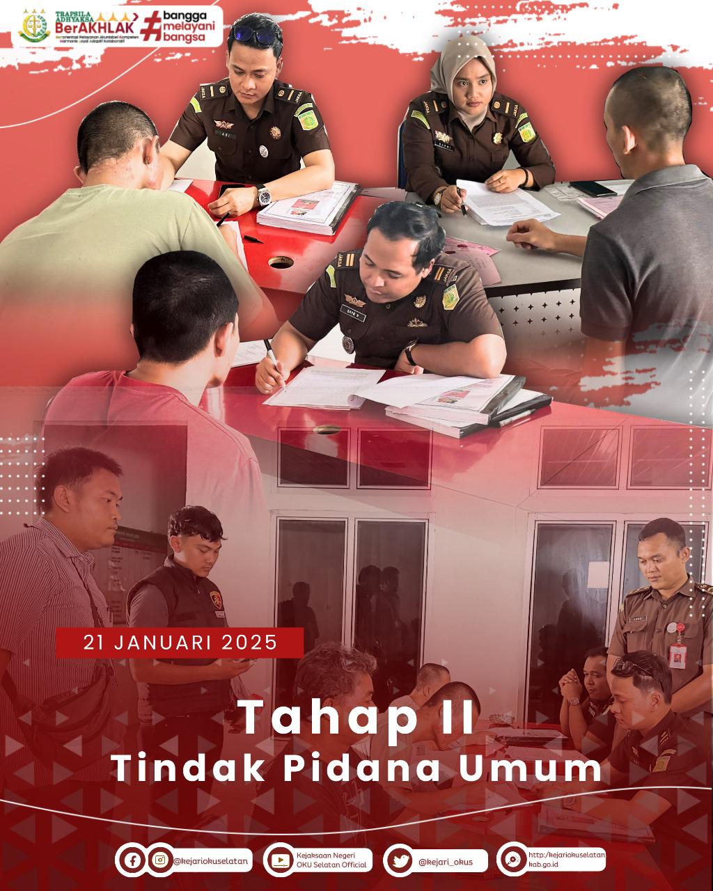 Selasa, 21 Januari 2025 bertempat di Ruang Tindak Pidana Umum Kejaksaan Negeri Ogan Komering Ulu Selatan, Tim Jaksa Penuntut Umum pada Kejaksaan Negeri Ogan Komering Ulu Selatan Rahmat Zainudin, S.H, Bayu Nusantara Palwa, S.H., Angga W. Putra, S.H, Feriadi, S.H, dan Darmilianti Permata, S.H., M.H melakukan Tahap II tersangka atas nama Tersangka :
