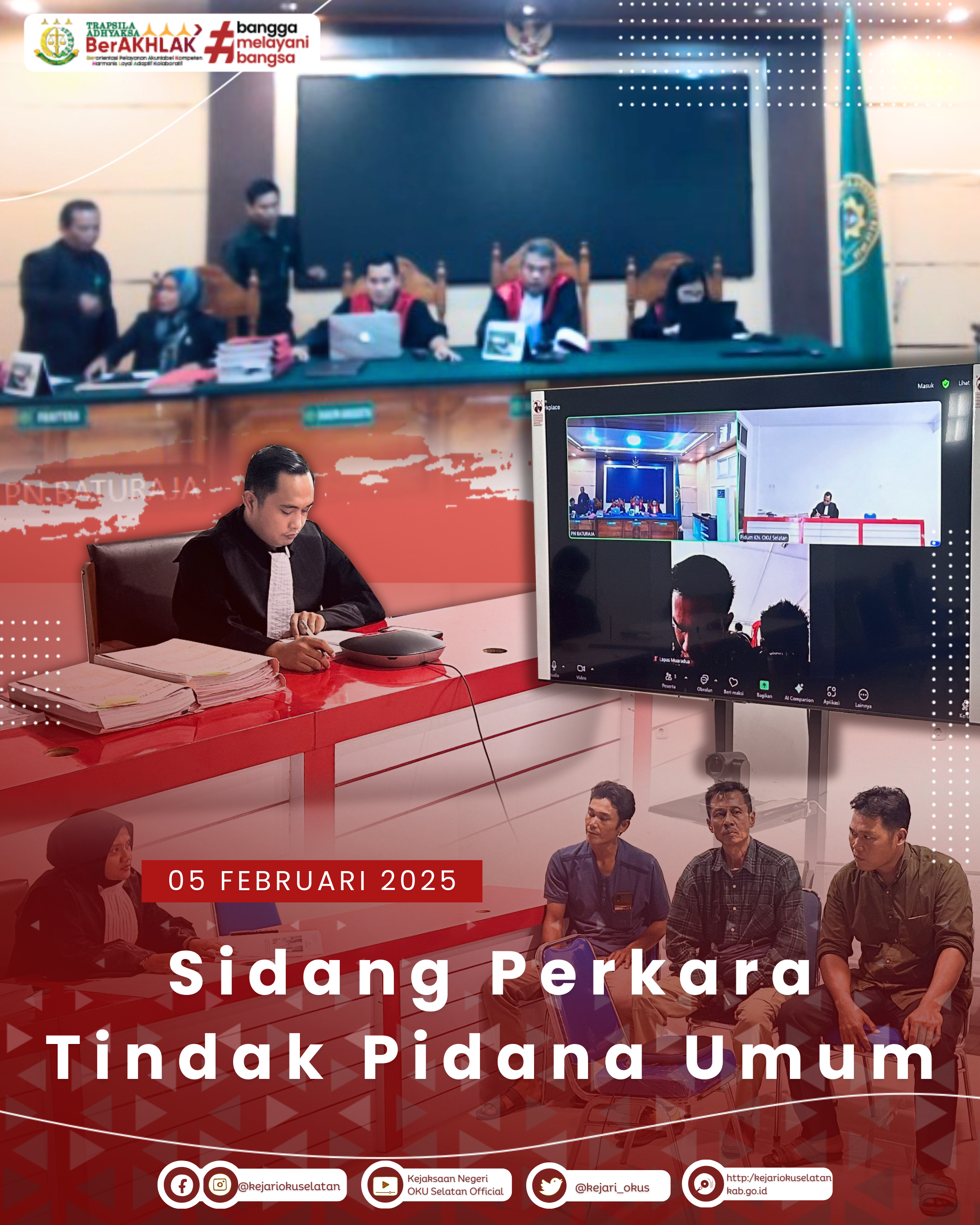 Rabu, 05 Februari 2025 telah dilaksanakan Kegiatan Sidang Tindak Pidana Umum Kejaksaan Negeri Ogan Komering Ulu Selatan secara daring melalui zoom. Jaksa Penuntut Umum melaksanakan sidang di Ruang Tindak Pidana Umum Kejaksaan Negeri Ogan Komering Ulu Selatan, Majelis Hakim melaksanakan sidang di Ruang Sidang Pengadilan Negeri Baturaja serta para terdakwa menjalani sidang bertempat di Lapas Kelas IIB Muaradua.