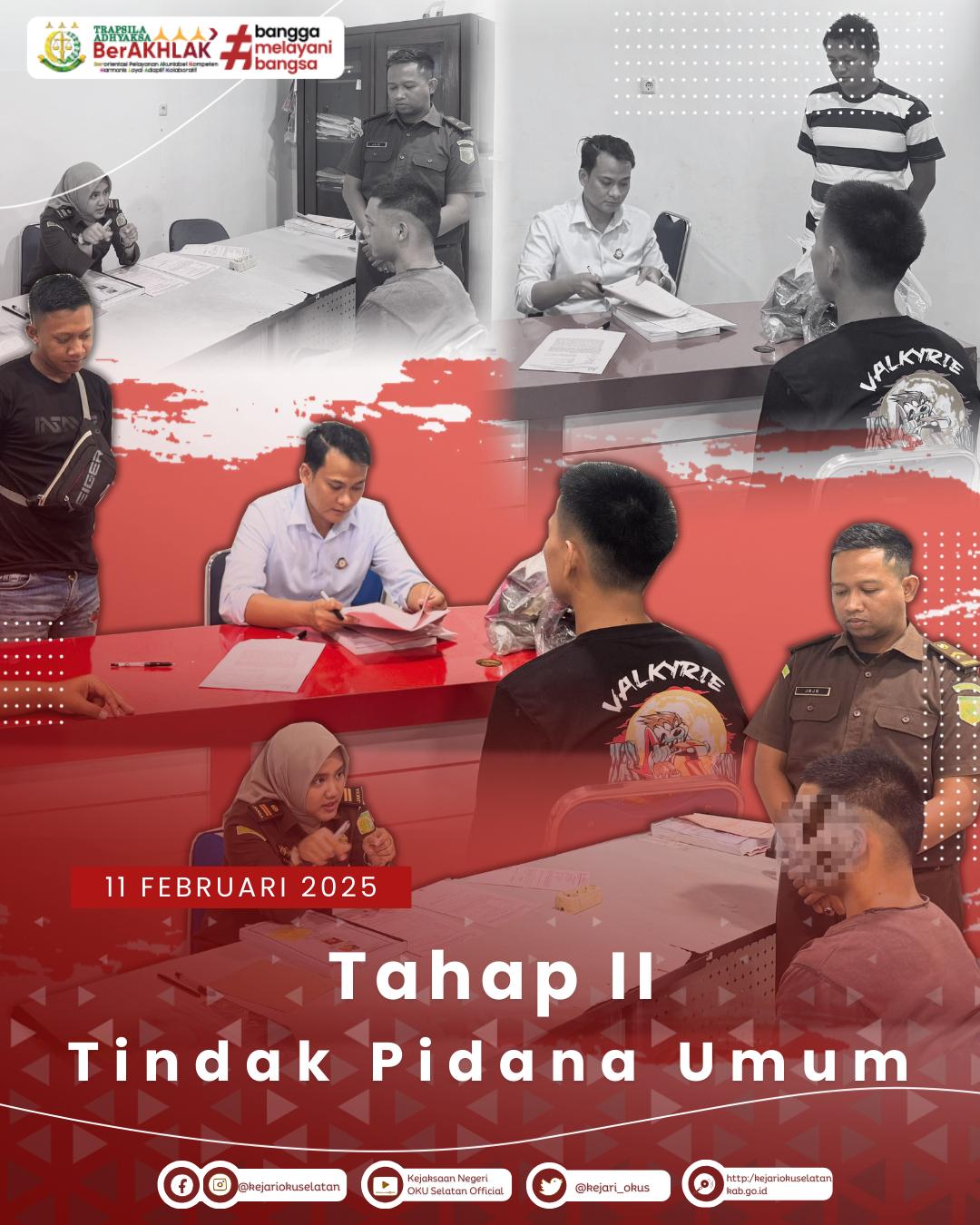 Selasa, 11 Februari 2025 bertempat di Ruang Tindak Pidana Umum Kejaksaan Negeri Ogan Komering Ulu Selatan, Tim Jaksa Penuntut Umum pada Kejaksaan Negeri Ogan Komering Ulu Selatan Bayu Nusantara Palwa, S.H, Darmilianti Permata, S.H., M.H, dan Feriadi, S.H, melakukan Tahap II tersangka atas nama Tersangka :