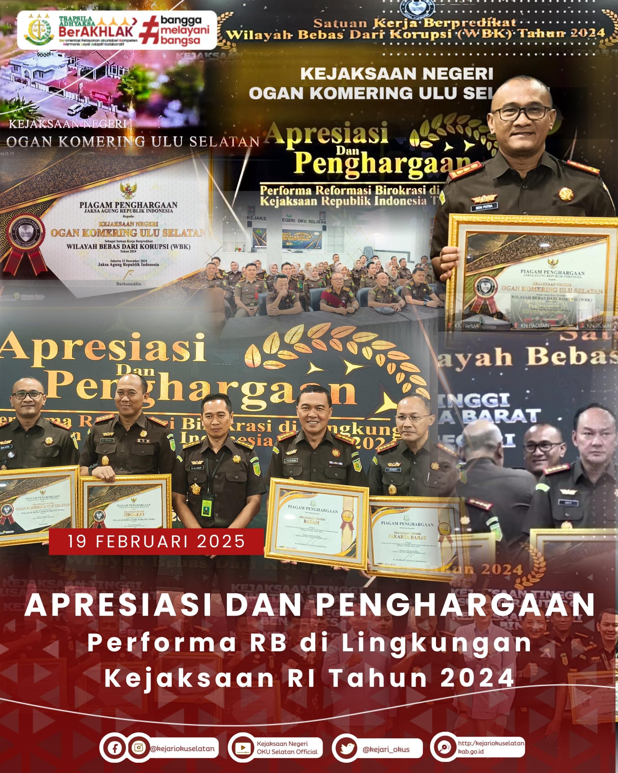Rabu, 19 Februari 2025 pukul 10.00 WIB, bertempat di Aula Gedung Utama Kejaksaan Agung Republik Indonesia, Kepala Kejaksaan Negeri Ogan Komering Ulu Selatan, Bapak Beni Putra, S.H., M.H., menerima penghargaan secara langsung dari Wakil Jaksa Agung RI, Bapak Feri Wibisono, S.H., M.H., C.N. Beliau hadir selaku Ketua Tim Pengarah Program dan Pelaporan Kegiatan Reformasi Birokrasi Kejaksaan Republik Indonesia untuk menyerahkan penghargaan Satuan Kerja dengan Predikat Wilayah Bebas Korupsi (WBK) tahun 2024.