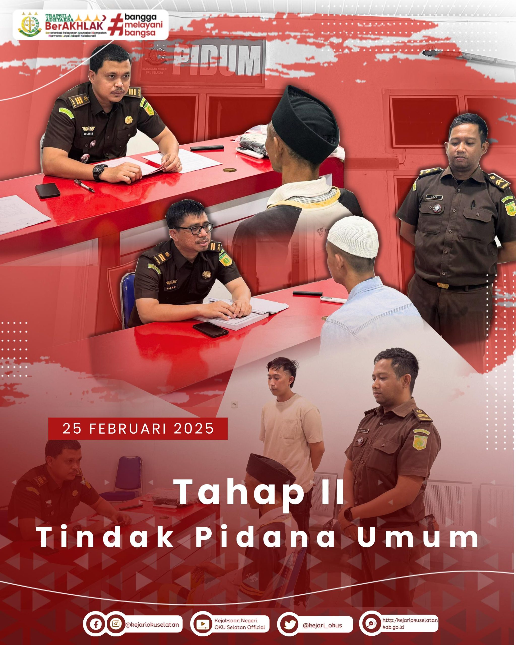 Selasa, 25 Februari 2025 bertempat di Ruang Tindak Pidana Umum Kejaksaan Negeri Ogan Komering Ulu Selatan, Tim Jaksa Penuntut Umum pada Kejaksaan Negeri Ogan Komering Ulu Selatan M. Ariansyah Putra, S.H., M.H, Solihin, S.H, dan Rahmat Zainudin , S.H, melakukan Tahap II tersangka atas nama Tersangka :