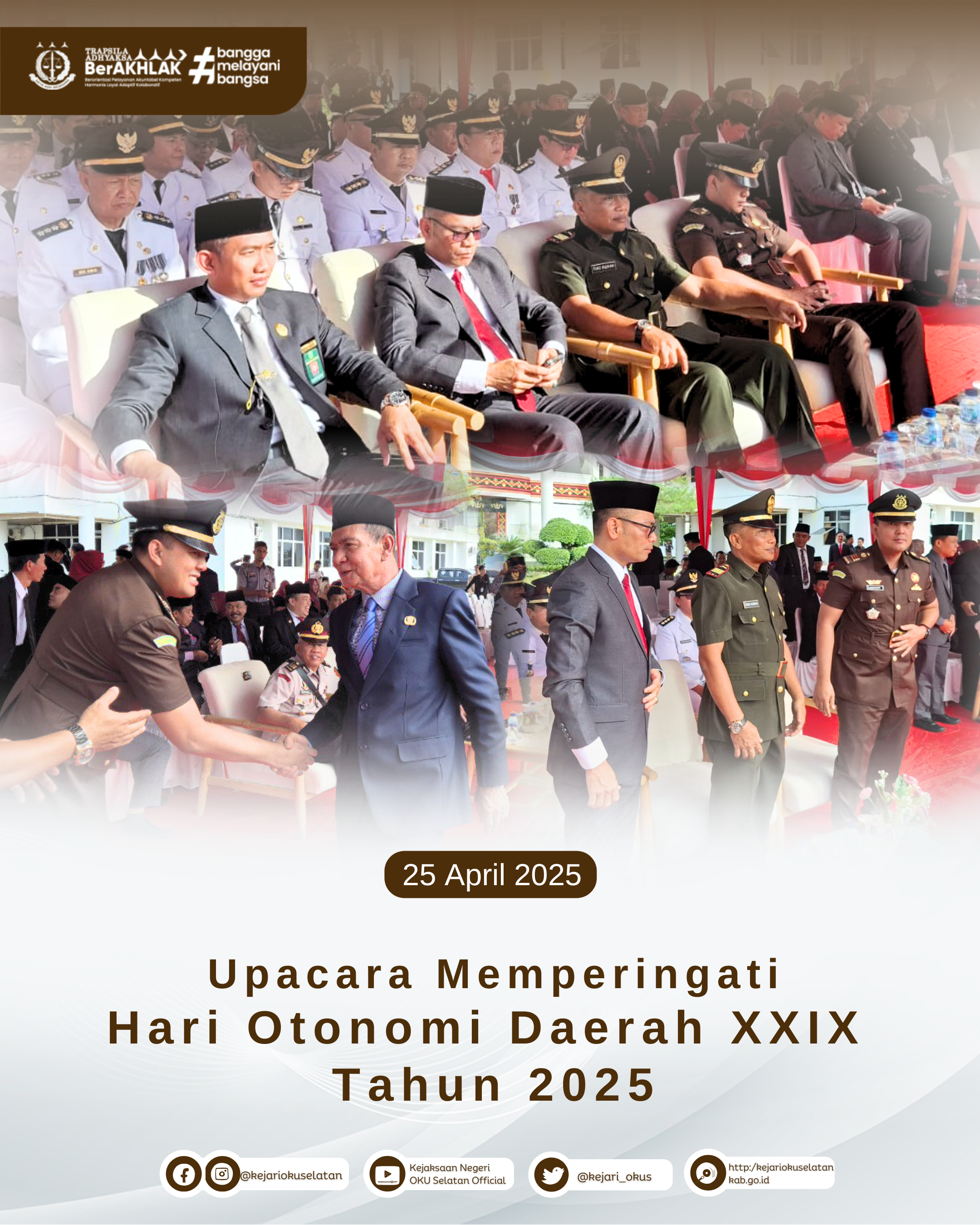 Jum’at, 25 April 2025, pukul 08.00 WIB, telah dilaksanakan Upacara Peringatan Hari Otonomi Daerah ke-XXIX bertempat di Lapangan Upacara Pemerintah…