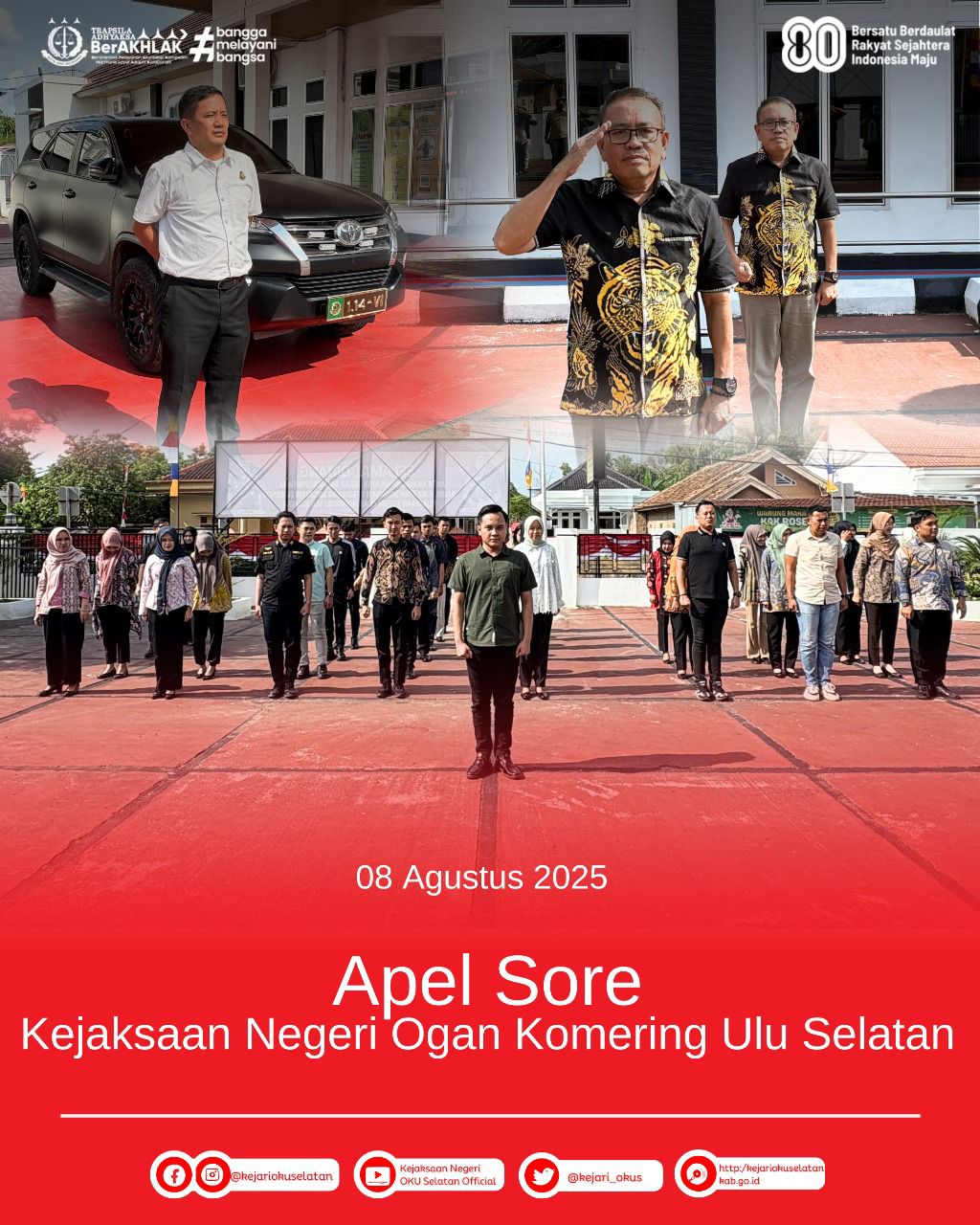 Jum’at, 08 Agustus 2025 Pukul 16.00 WIB telah dilaksanakan Apel Sore di Lapangan Kantor Kejaksaan Negeri Ogan Komering Ulu Selatan.…