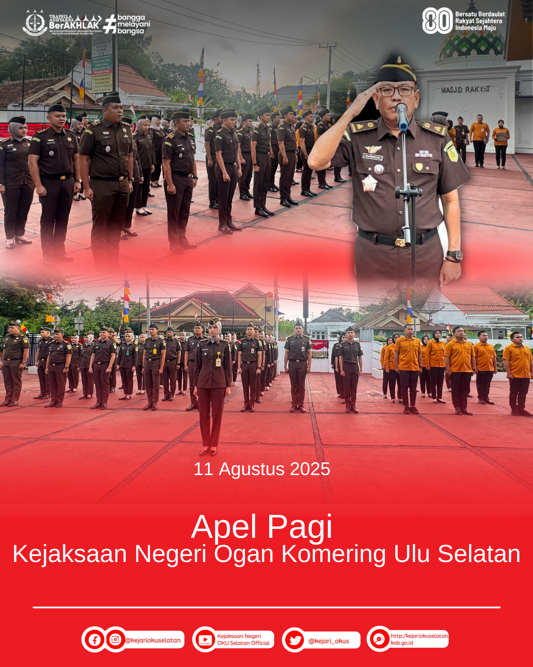 Senin, 11 Agustus 2025, sekira pukul 07.30 WIB, telah dilaksanakan Apel Pagi Rutin di Lapangan Kantor Kejaksaan Negeri Ogan Komering…