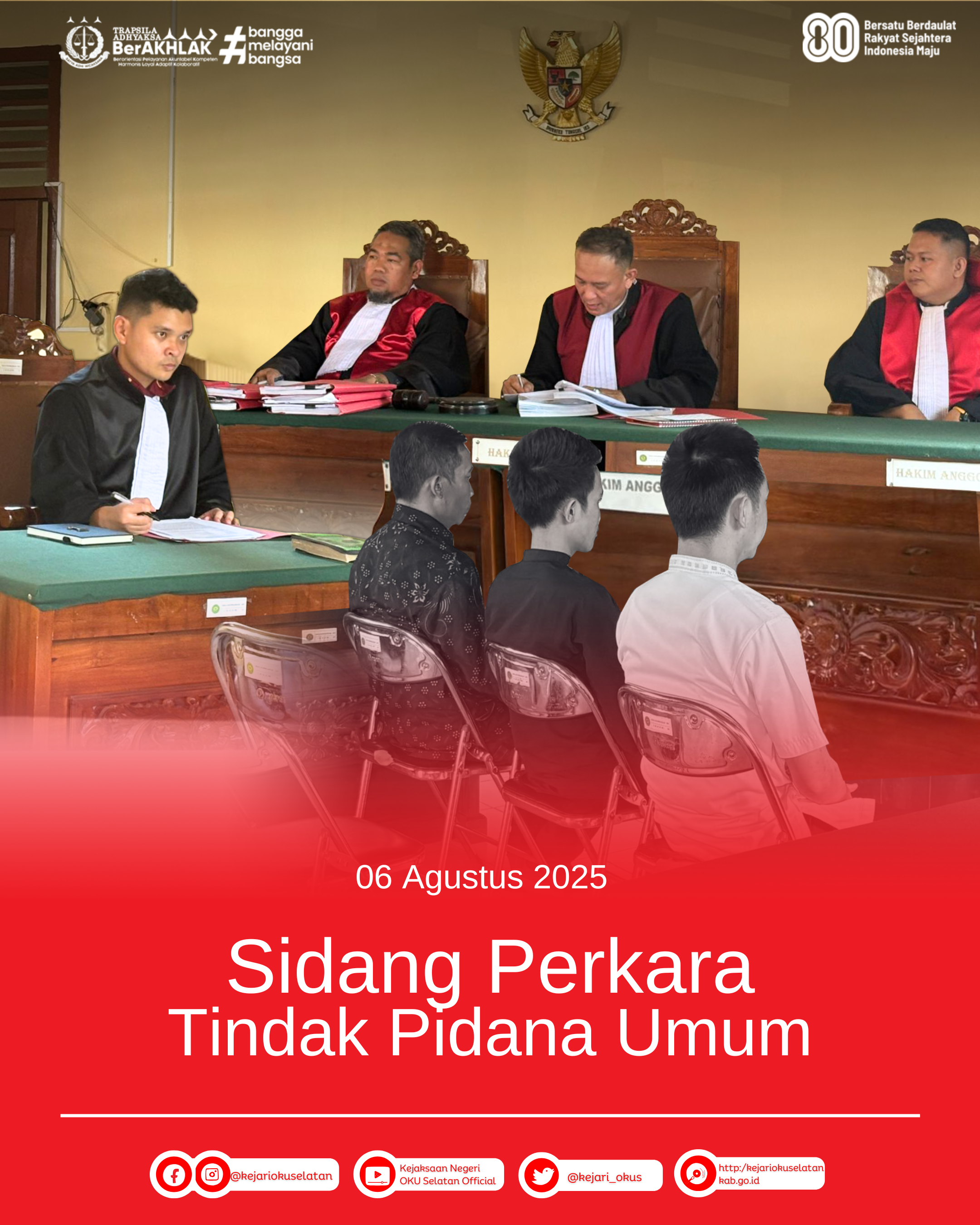 Rabu, 13 Agustus 2025 Kejaksaan Negeri Ogan Komering Ulu Selatan melaksanakan Kegiatan Sidang Perkara Tindak Pidana Umum pada Pengadilan Negeri…