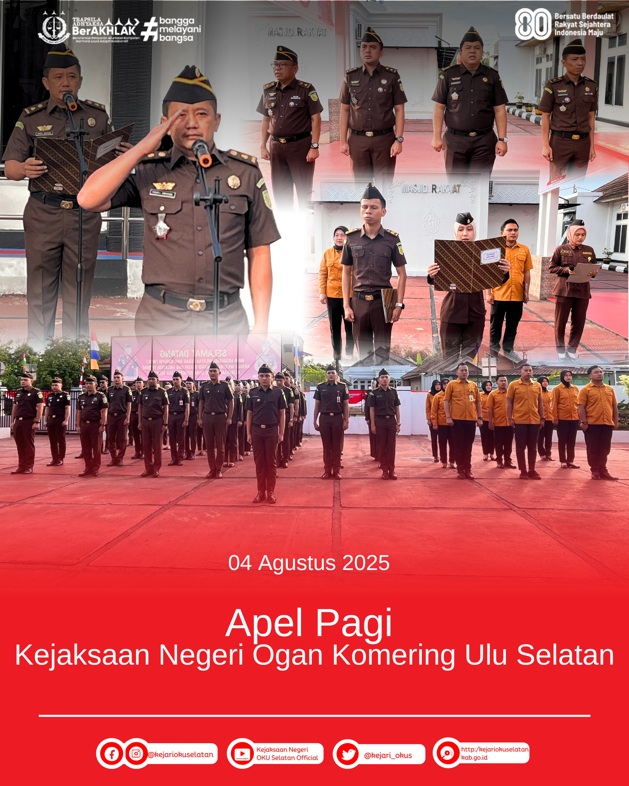 Senin, 04 Agustus 2025, sekira pukul 07.30 WIB, telah dilaksanakan Apel Pagi Rutin di Lapangan Kantor Kejaksaan Negeri Ogan Komering…