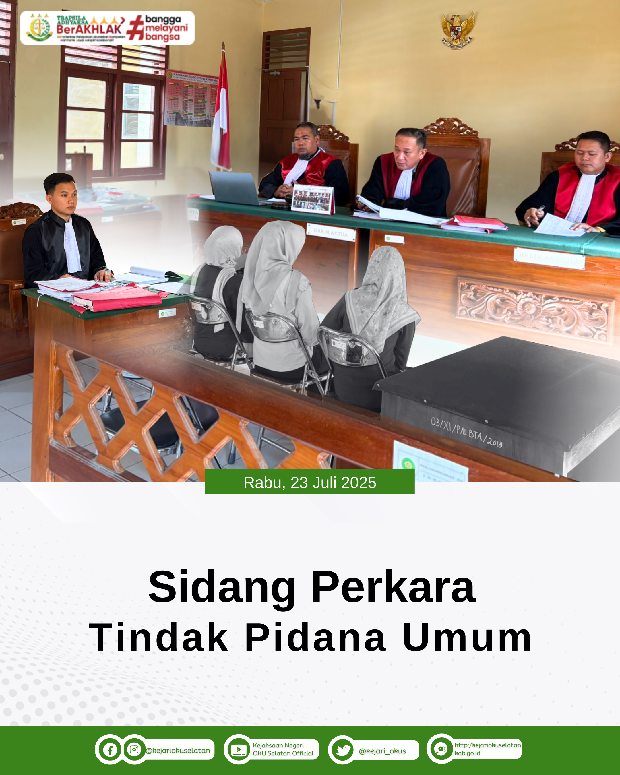 Rabu, 23 Juli 2025 Kejaksaan Negeri Ogan Komering Ulu Selatan melaksanakan Kegiatan Sidang Perkara Tindak Pidana Umum pada Pengadilan Negeri…