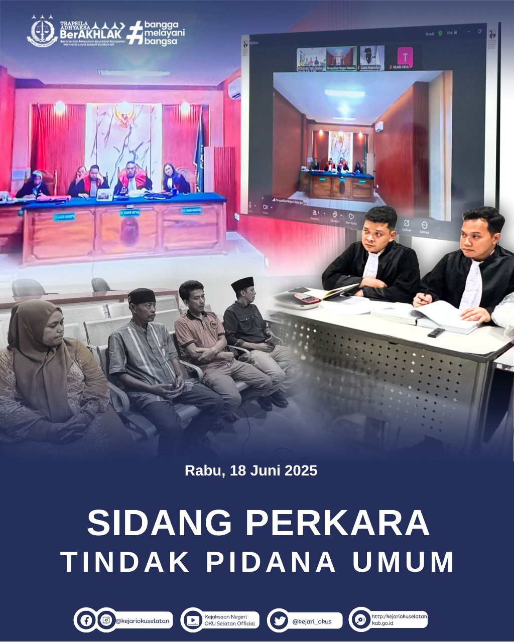 Rabu, 18 Juni 2025 telah dilaksanakan Kegiatan Sidang Tindak Pidana Umum Kejaksaan Negeri Ogan Komering Ulu Selatan secara daring melalui…