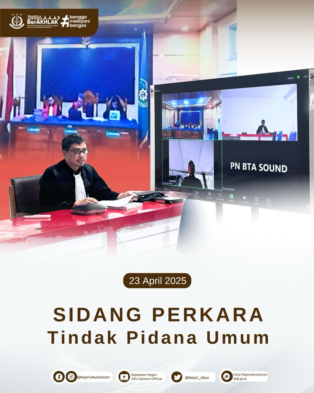 Rabu, 23 April 2025 telah dilaksanakan Kegiatan Sidang Tindak Pidana Umum Kejaksaan Negeri Ogan Komering Ulu Selatan secara daring melalui…