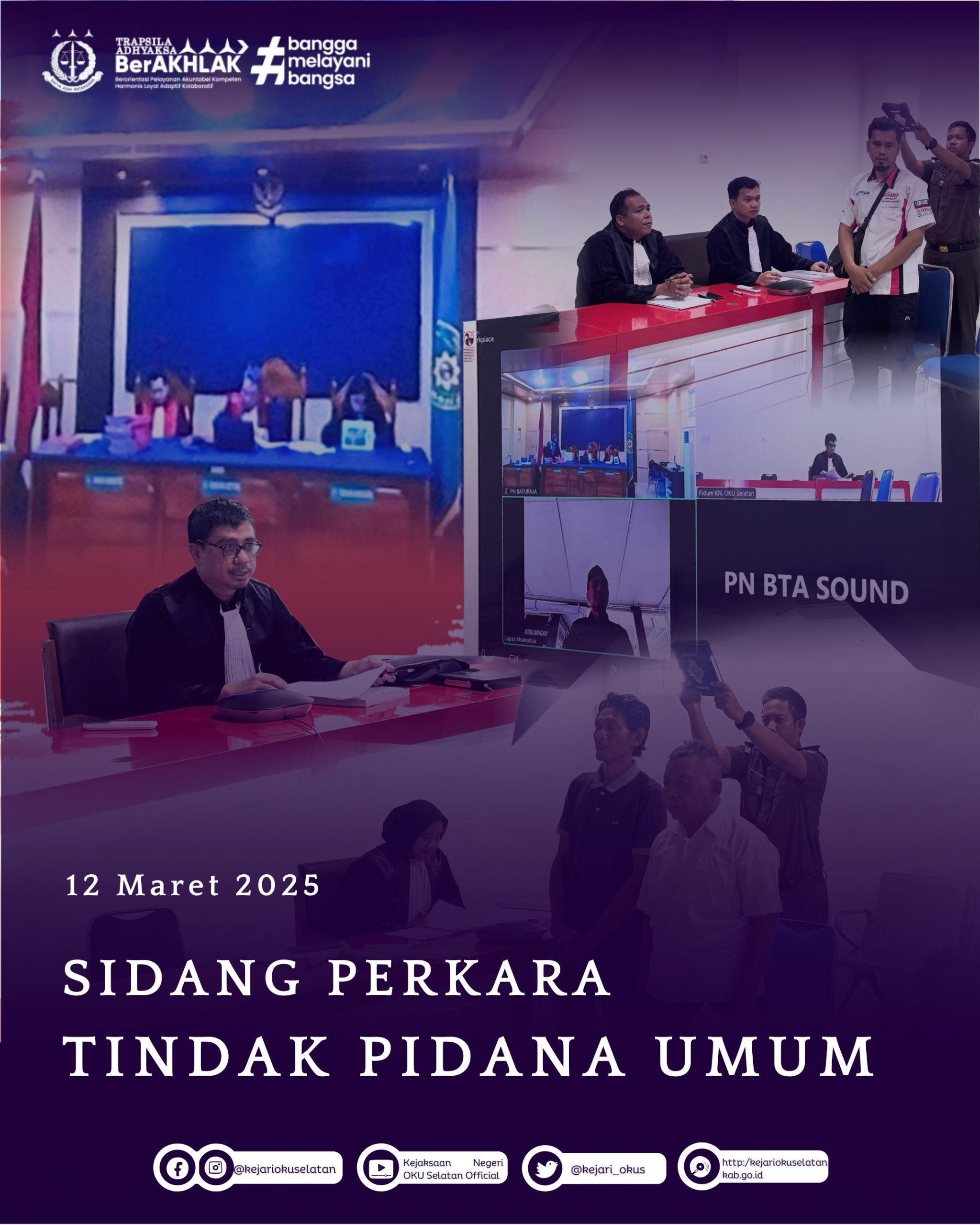 Rabu, 12 Maret 2025 telah dilaksanakan Kegiatan Sidang Tindak Pidana Umum Kejaksaan Negeri Ogan Komering Ulu Selatan secara daring melalui…