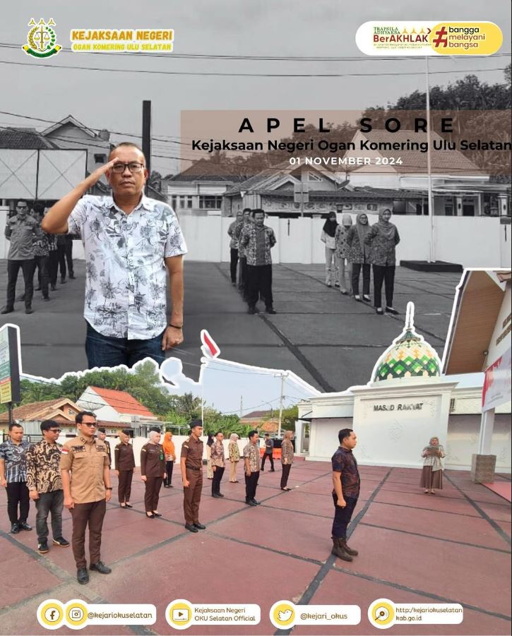 Jum’at, 01 November 2024 bertempat di lapangan Kejaksaan Negeri Ogan Komering Ulu Selatan telah dilaksanakan apel sore yang dipimpin oleh…
